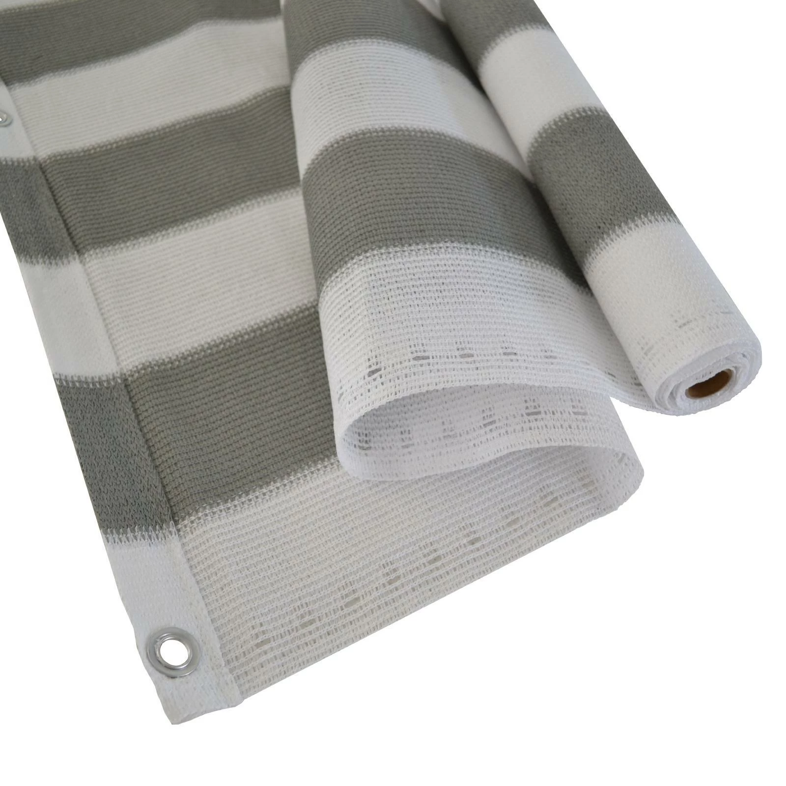 Marquee 1.8m high shade cloth is ideal for a wide range of applications including privacy screening, wind break or to shade areas from the sun in summer. Give your outdoor space an instant new look! The grey and white horizontal stripes will complement most home exterior colour schemes. Knitted and metal eyelets make installation a breeze.
